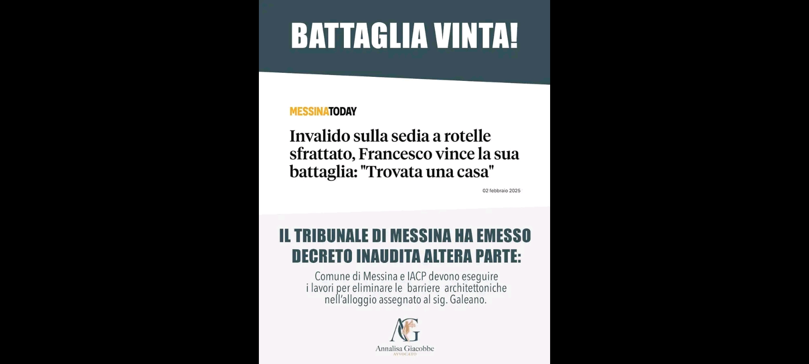 - “Il Tribunale, riconoscendo le nostre ragioni, ha emanato un decreto inaudita altera parte, ossia senza convocare preventivamente le controparti in ragione dell’urgenza della situazione, ordinando al Comune di Messina e allo IACP di eseguire, a propria cura e spese, i lavori necessari per l’eliminazione delle barriere architettoniche presenti nell’alloggio ERP assegnato al sig. Galeano”;