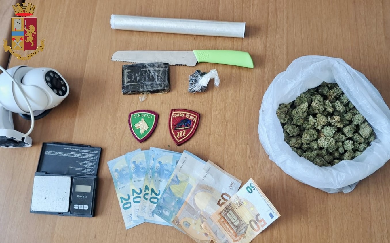 Le perquisizioni domiciliari effettuate a loro carico hanno portato al sequestro di sostanza stupefacente del tipo hashish e marijuana. In particolare, a carico del ventottenne, i poliziotti hanno rinvenuto 114 grammi di hashish allo stato solido e suddivisi in più panetti. L’hashish era celato all’interno di un comodino della camera da letto dell’uomo dove sono stati trovati e sequestrati anche 127 grammi di marijuana allo stato erbaceo. Con la droga, i poliziotti hanno proceduto al sequestro di un bilancino di precisione e di un coltello lungo 31 cm, entrambi con evidenti tracce di sostanza stupefacente e di altro materiale generalmente atto al confezionamento delle singole dosi.