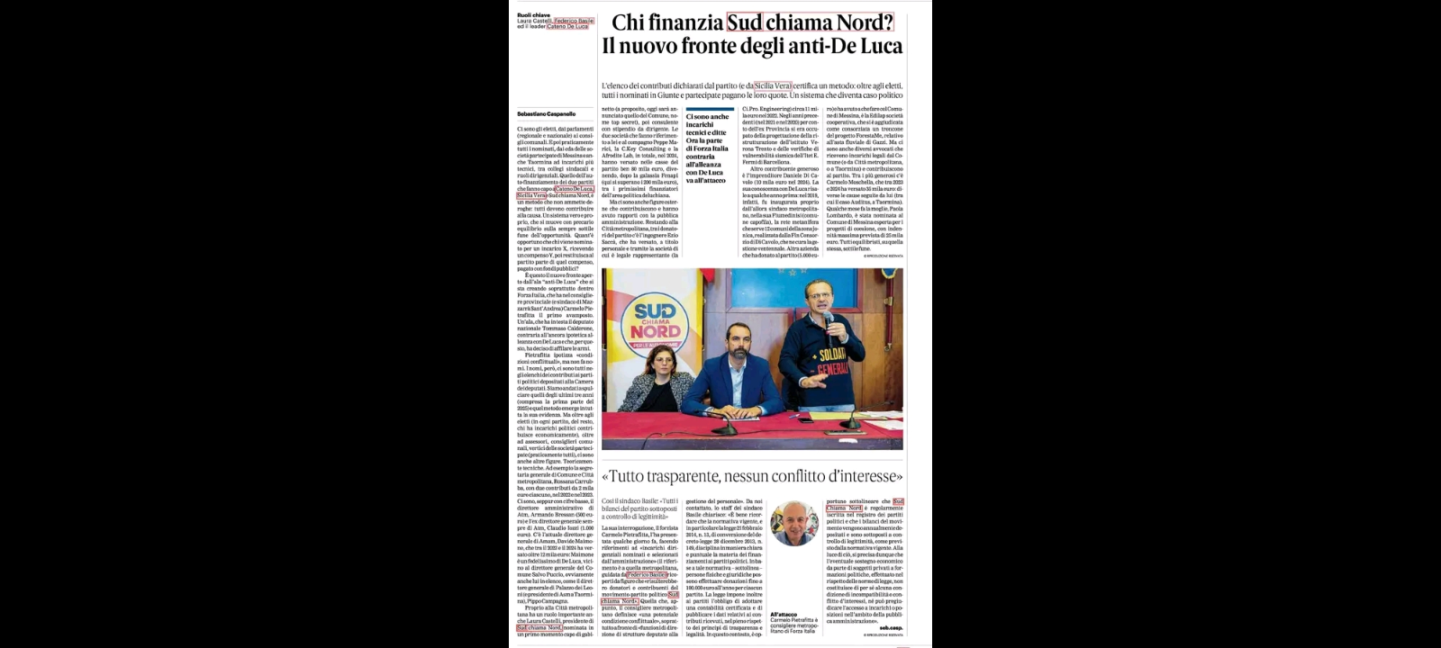 “Stavolta qualcuno si farà male: Si svolgerà lunedì 7 luglio alle ore 9:30, presso il Salone delle Bandiere di Palazzo Zanca, la conferenza stampa di Cateno De Luca, Federico Basile, Laura Castelli e Danilo Lo Giudice in merito alle modalità di finanziamento di Sicilia Vera e Sud chiama Nord”. A comunicarlo ieri, sulle sue omonime Pagine Facebook, è stato il sindaco di Taormina, Cateno De Luca, fondatore del ‘Movimento Sud chiama Nord’ e deputato presso l’Assemblea regionale siciliana a Palermo.