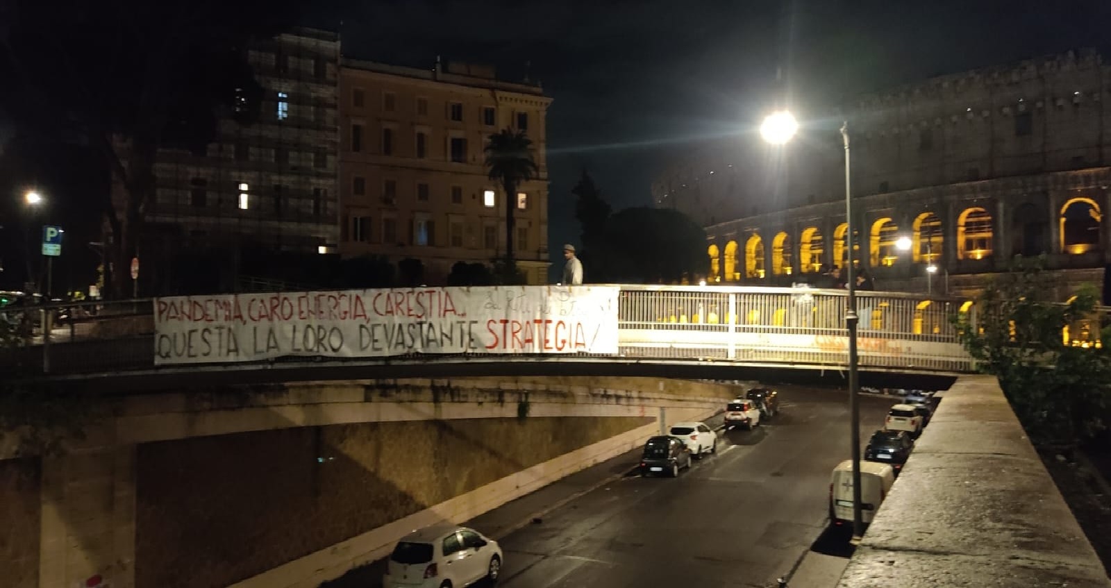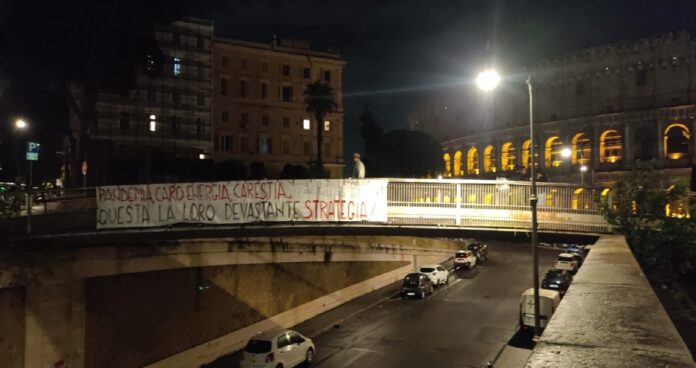 Striscione de La Rete dei Patrioti al Colosseo, recante la scritta “Pandemia, caro energia, carestia, questa la loro devastante strategia”. Scopo dell’azione quello di rimarcare il nesso ineludibile tra le emergenze incombenti sull’Italia, figlie di un medesimo piano criminale, finalizzato a depauperare il tessuto socio-economico del Paese e ad instillare insicurezza e instabilità sociale.