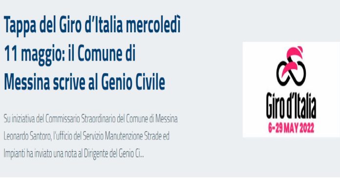 Su iniziativa del Commissario Straordinario del Comune di Messina Leonardo Santoro, l’ufficio del Servizio Manutenzione Strade ed Impianti ha inviato una nota al Dirigente del Genio Civile di Messina Nicola Alleruzzo, al fine di fornire una fattiva collaborazione nell’effettuazione dei lavori necessari per il ripristino della pavimentazione stradale di alcune strade ricadenti nel territorio del Comune di Messina ed interessate dal passaggio del “Giro d’Italia” in programma il prossimo mercoledì 11 maggio.
