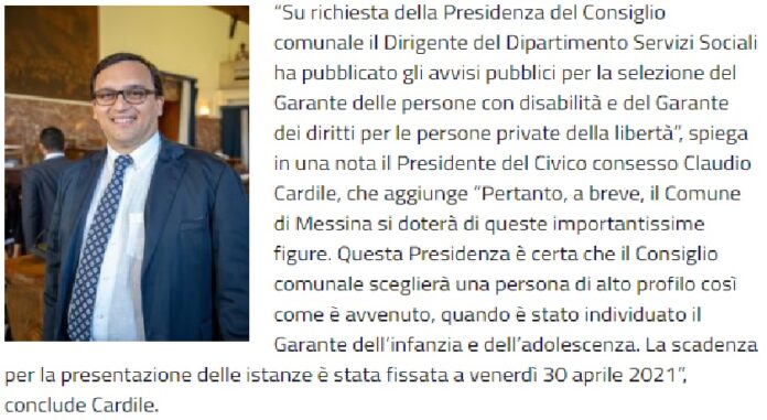 Cardile aggiunge e conclude: “pertanto, a breve, il Comune di Messina si doterà di queste importantissime figure. Questa Presidenza è certa che il Consiglio comunale sceglierà una persona di alto profilo così come è avvenuto, quando è stato individuato il Garante dell’infanzia e dell’adolescenza. La scadenza per la presentazione delle istanze è stata fissata a venerdì 30 aprile 2021”.