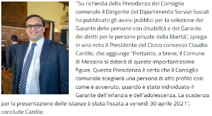 “Su richiesta della Presidenza del Consiglio comunale il Dirigente del Dipartimento Servizi Sociali ha pubblicato gli avvisi pubblici per la selezione del Garante delle persone con disabilità e del Garante dei diritti per le persone private della libertà”, spiega in una nota il Presidente del Civico consesso Claudio Cardile.