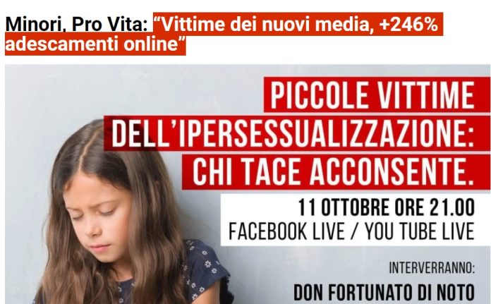 Il vicepresidente di Pro Vita e Famiglia Onlus ricorda che alla luce di questi dati i primi di settembre è stata lanciata la campagna “Piccole Vittime Invisibili” con una conferenza stampa in Senato. “In seguito – continua – abbiamo lanciato un documentario in collaborazione con Meter onlus di don Fortunato di Noto, che da anni si occupa di queste tematiche, e questa sera alle 21 avremo un webinar per fare il punto della situazione. Il webinar sarà visibile sul nostro canale Youtube e sulla nostra pagina Facebook in diretta”.