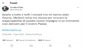 Spoglio ultimato per le elezioni suppletive del collegio Roma 1 della Camera dei Deputati. Prima di vedere le percentuali, candidato per candidato, ecco il tweet della vincitrice del seggio, Cecilia D’Elia. L’esponente Pd, non appena proclamata eletta completerà il collegio dei Grandi elettori per il Quirinale portandolo a 1009 componenti.