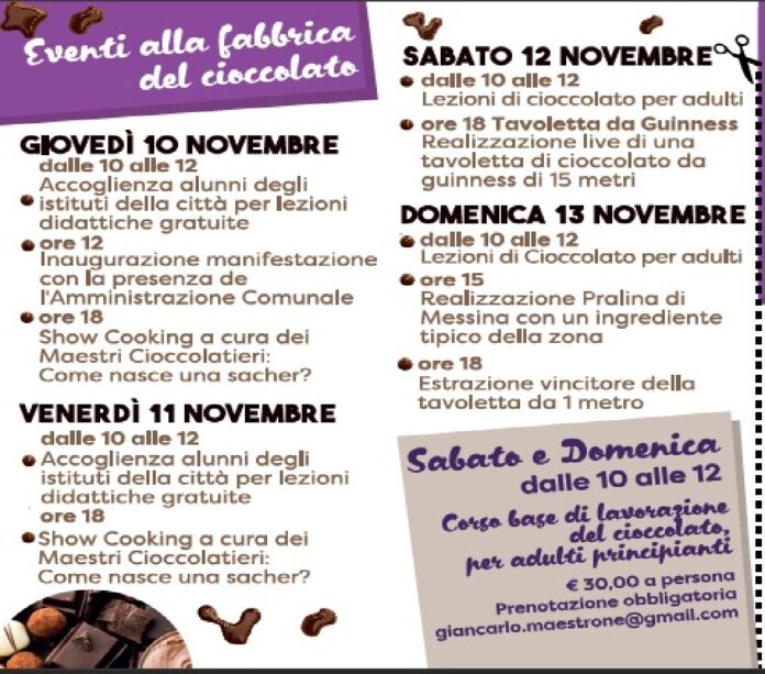 La manifestazione è organizzata da Chocomoments, con il Patrocinio del Comune di Messina, in collaborazione con BlueSeaInSicily, agenzia di eventi con il supporto di Enzo Trimarchi e Teresa Impollonia, e rappresenta per adulti e bambini l’evento più dolce dell’anno: da domani, giovedì 10, sino a domenica 13, la Fabbrica del Cioccolato con tutte le sue attrazioni arriva nel centro di Messina.
