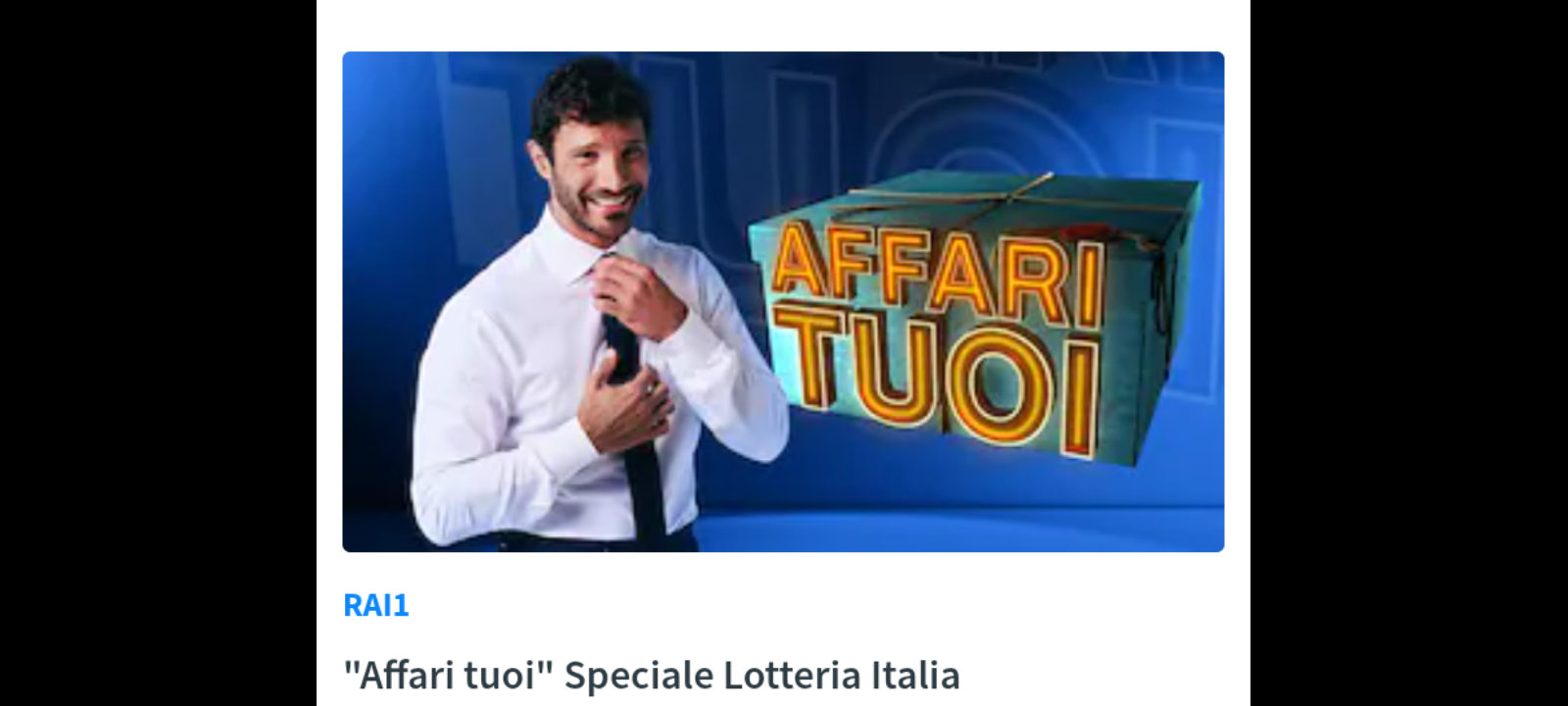 Torna il tradizionale appuntamento con “Affari Tuoi” e la Lotteria Italia: martedì 6 gennaio, in diretta dalle 20.35 su Rai1, andrà in onda “Affari Tuoi – Speciale Lotteria Italia”, la puntata speciale del game show condotto da Stefano De Martino, prodotto dai responsabili della Direzione Intrattenimento Prime Time in collaborazione con i membri di Endemol Shine Italy, in cui verranno svelati i biglietti vincenti, con il primo premio da 5 milioni di euro.