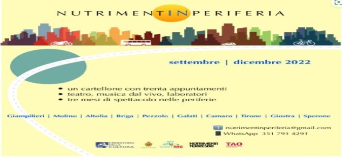 Tra pochi giorni partirà NUTRIMENTINPERIFERIA, un progetto finanziato dal Ministero della Cultura e dal Comune di Messina per eventi di spettacolo dal vivo, grazie a un bando pubblico che il Ministero ha pensato per le Città Metropolitane e il rilancio delle attività culturali nelle periferie. Nutrimenti Terrestri sta lavorando ad un nutrito cartellone di teatro, musica dal vivo e attività laboratori, che verrà realizzato da settembre a dicembre 2022, nelle zone di Giampilieri, Molino, Altolia, Briga, Pezzolo, Galati, Camaro, Tirone, Giostra e Sperone.