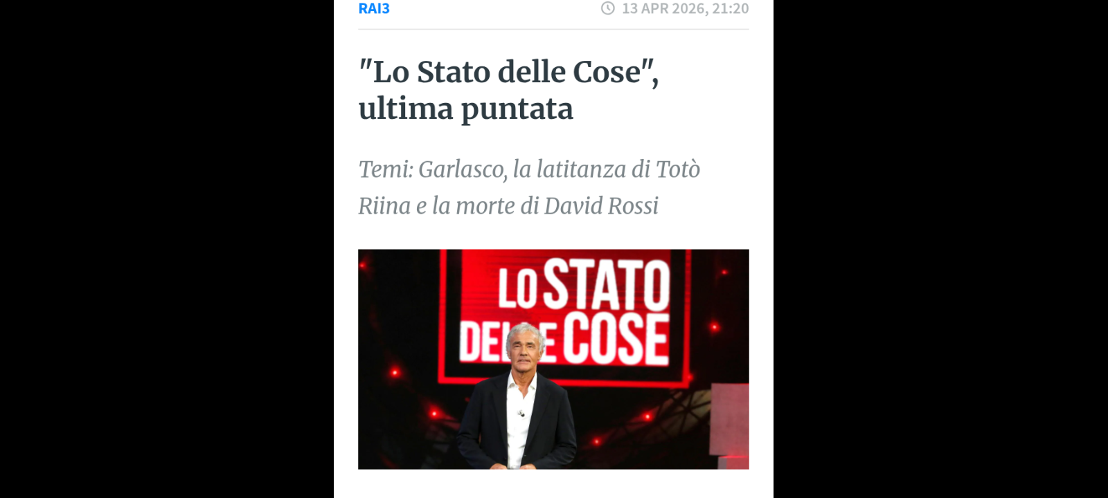 Ultima puntata per “Lo Stato delle Cose”, il programma di Massimo Giletti che è iniziato in onda lunedì 13 aprile alle 21.20 su Rai3.