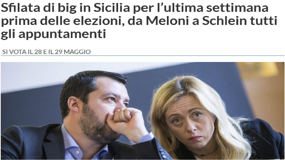 Ultimi giorni di campagna elettorale in Sicilia, in vista delle elezioni del 28 e del 29 maggio, e arrivano i pesi massimi: soprattutto a Catania, dove si vota per eleggere il sindaco, sarà una vera e propria sfilata di leader politici. Per sostenere Enrico Trantino, candidato sindaco, venerdì 26 maggio, l’ultima disponibile prima del silenzio elettorale e dell’apertura dei seggi, ci saranno tutte e tre le punte del comando nazionale… la premier Giorgia Meloni sarà affiancata dal leghista Matteo Salvini e dal coordinatore di Forza Italia, Antonio Tajani. Questo giusto per far capire quanto “pesa” Catania, anche a livello nazionale, nella tornata di elezioni.