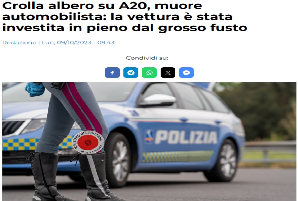 Un automobilista è morto in seguito al crollo di un albero sulla sua auto lungo l’autostrada A20 nel Palermitano, tra gli svincoli di Campofelice di Roccella e Cefalù.