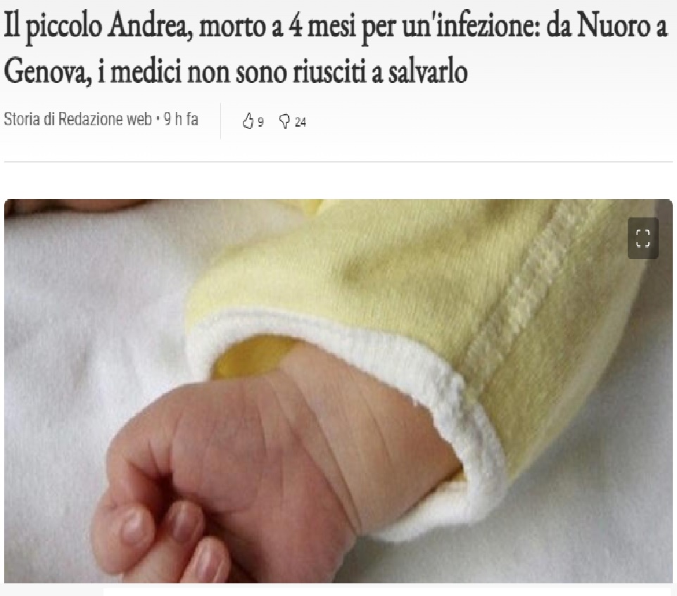 Un bimbo di appena quattro mesi è morto, dopo alcuni giorni di ricovero in ospedale, si chiamava Andrea Concas: il piccolo era stato ricoverato una settimana fa nel reparto pediatrico dell’ospedale di Nuoro, e i medici avevano deciso di trasferirlo d’urgenza in una struttura più idonea, l’ospedale Gaslini di Genova dove poi è deceduto. Andrea era originario di Fonni, in provincia di Nuoro, dove tutta la comunità si è stretta intorno al dolore dei genitori che hanno perso il loro piccolo.