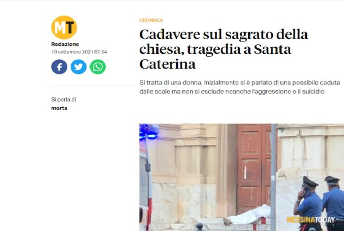 Un cadavere…, è stato trovato sul sagrato della Chiesa di Santa Caterina a Messina in via Garibaldi. E’ quello di una donna e le spoglie presentano un’ampia ferita al collo. All’inizio del rinvenimento, gli inquirenti hanno ipotizzato la caduta sulle scale, ma non vengono tralasciate altre piste come quella del suicidio o dell’aggressione… considerando l’esistenza di una considerevole scia di sangue sugli scalini di accesso all’edificio sacro.