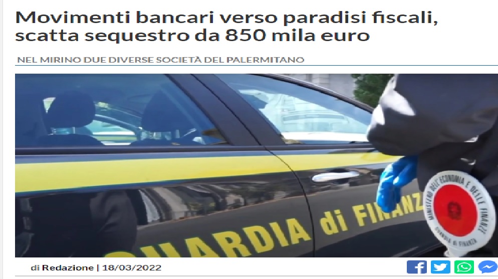 L’attenzione investigativa sulla presunta anomala operatività delle società palermitane ha permesso di individuare considerevoli movimentazioni finanziarie che dall’Italia sono confluite verso conti correnti stranieri intestati a società con sede nello Stato americano del Delaware, considerato uno dei più attrattivi paradisi fiscali al mondo. In base agli elementi finora raccolti dalle fiamme gialle, sono emersi indizi secondo i quali le fatture annotate dalle società palermitane sarebbero da considerarsi “false” e sarebbero state utilizzate al fine di evadere le imposte, giustificare le uscite dalle casse societarie e il trasferimento di denaro su conti correnti radicati all’estero.