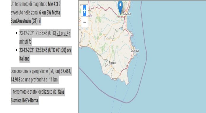 Un terremoto di magnitudo Mw 4.3 è avvenuto nella zona: 6 km SW Motta Sant’Anastasia (CT), il 23-12-2021 21:33:45, con coordinate geografiche (lat, lon) 37.484, 14.918 ad una profondità di 11 km.