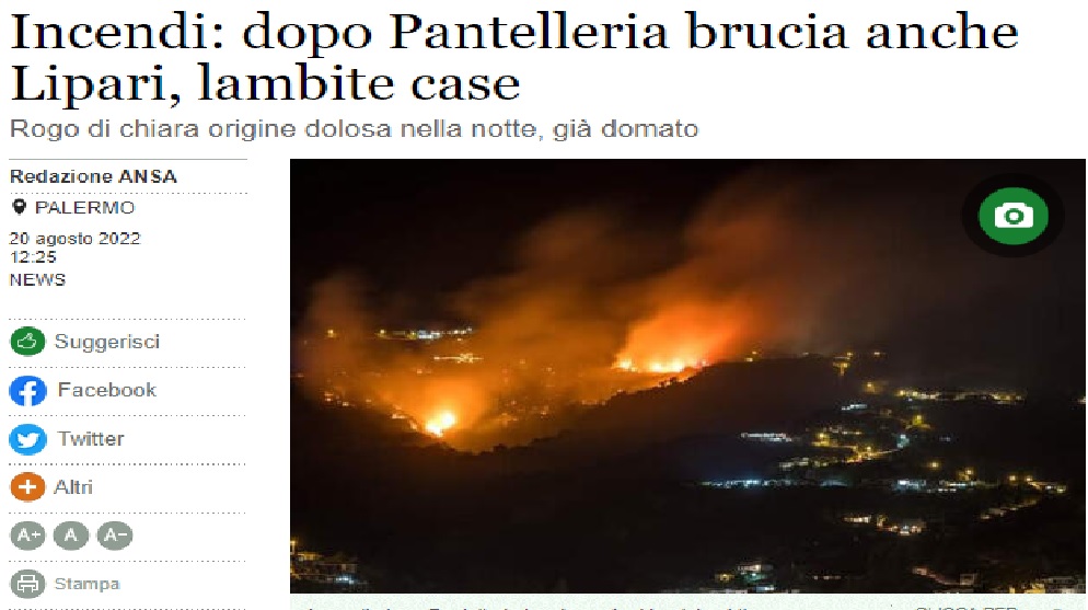 Un vasto incendio di chiara matrice dolosa, come quello divampato martedì scorso a Pantelleria, si è sviluppato nella notte a Lipari, la più grande delle isole Eolie, nella frazione di Santa Margherita.