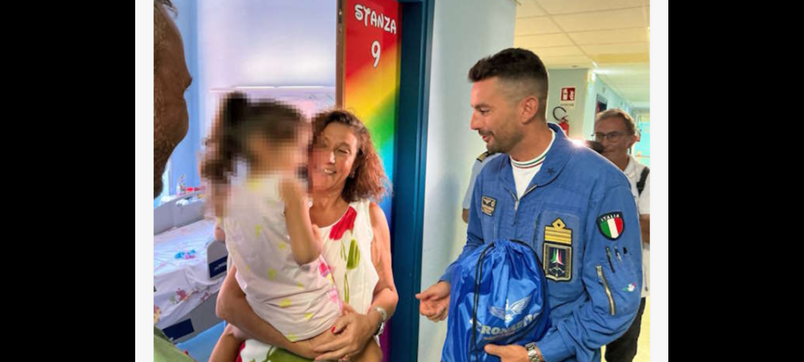 A rendere omaggio ai bambini ricoverati sono stati il comandante delle Frecce Tricolori, Francesco Paolo Marocco, il comandante del 41° Stormo di Sigonella, Stefano Spreafico, e il comandante dell’82° Centro SAR, Nicolò Nicolosi… con loro anche il Colonnello Stefano Pietropaoli, Capo dell’Ufficio Relazioni Esterne dello Stato Maggiore dell’Aeronautica Militare.
