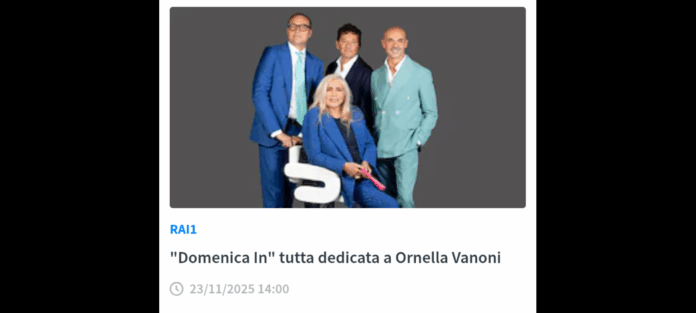 ‘Una puntata interamente dedicata al ricordo di Ornella Vanoni, icona della musica italiana recentemente scomparsa, per omaggiare una delle voci più amate della musica italiana, la sua arte, la sua eleganza e la sua straordinaria carriera’. È questo il tema del nuovo appuntamento che è iniziato oggi, Domenica 23 novembre alle 14.00 su Rai1 con “Domenica In”, in diretta dagli Studi Fabrizio Frizzi di Roma e condotto da Mara Venier, Tommaso Cerno, Enzo Miccio e Teo Mammucari.