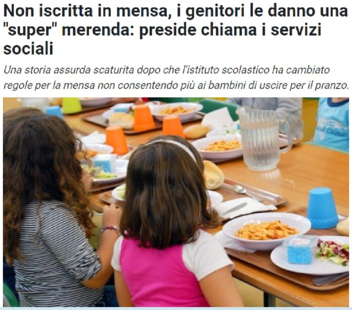 Una storia assurda scaturita per una semplice mancanza di tempo: la scuola ha cambiato in corsa le regole sulla mensa, impedendo ai bambini di tornare a casa a mezzogiorno per mangiare, pena il non poter più rientrare alle lezioni pomeridiane. I genitori, quindi, non riuscendo a iscrivere la propria figlia secondo tempistiche, le hanno dato una “super” merenda per far fronte al mancato pranzo. Un’iniziativa nata per tamponare l’emergenza di un giorno in attesa di mettersi in regola e per non far perdere alla bambina ore di lezione. Ma sulla vicenda si è alzato un polverone, con la preside che ha chiamato i servizi sociali perché la bimba, per regolamento, non poteva stare nell’istituto scolastico.