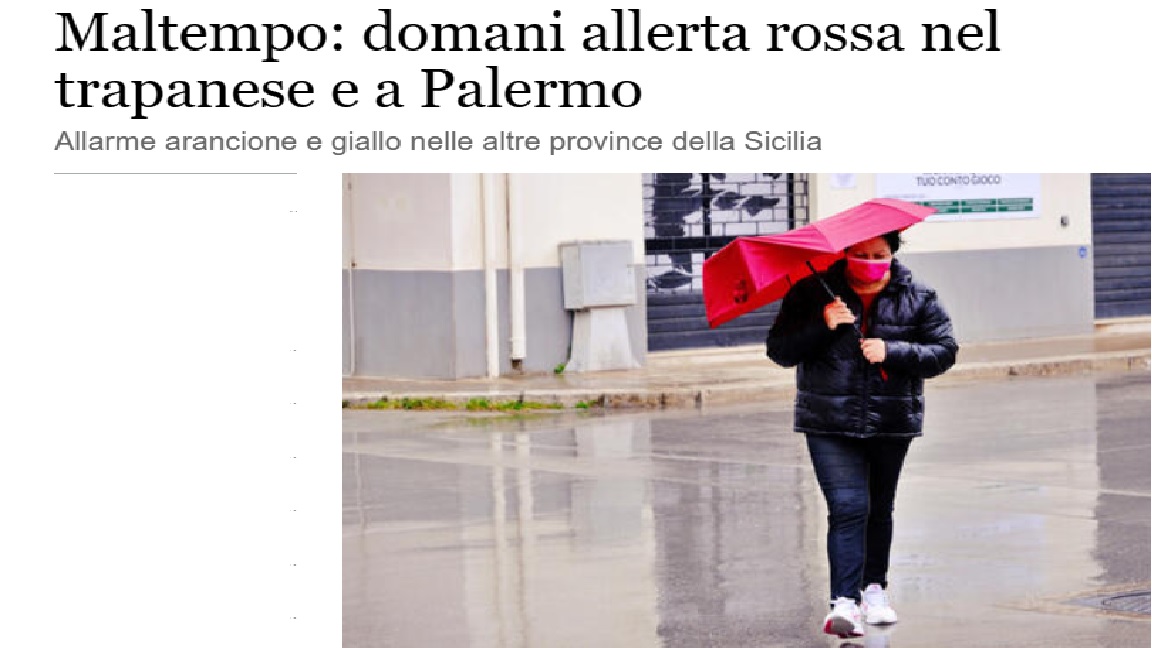 Un’allerta di colore rosso è stata diramata, poco fa, dal Dipartimento Regionale della Protezione Civile, per la provincia di Trapani e alcune zona del palermitano.
