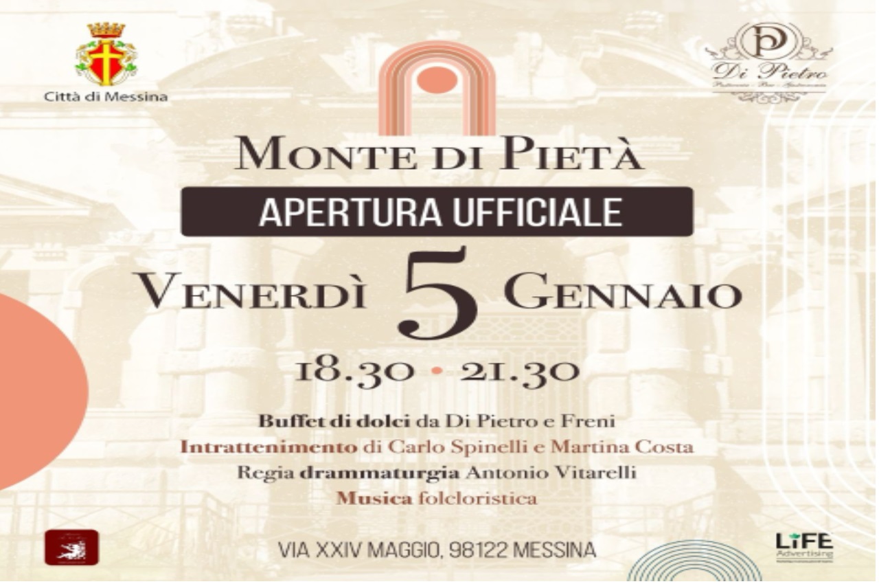 Venerdì 5 gennaio 2024, alle ore 18.30, al Monte di Pietà, il sindaco Federico Basile presenzierà con il Direttore Generale Salvo Puccio, la sua squadra di Assessori e i rappresentanti delle Partecipate comunali alla cerimonia di apertura alla fruizione della cittadinanza del Complesso Monumentale, passato di recente alla gestione della Città Metropolitana di Messina.