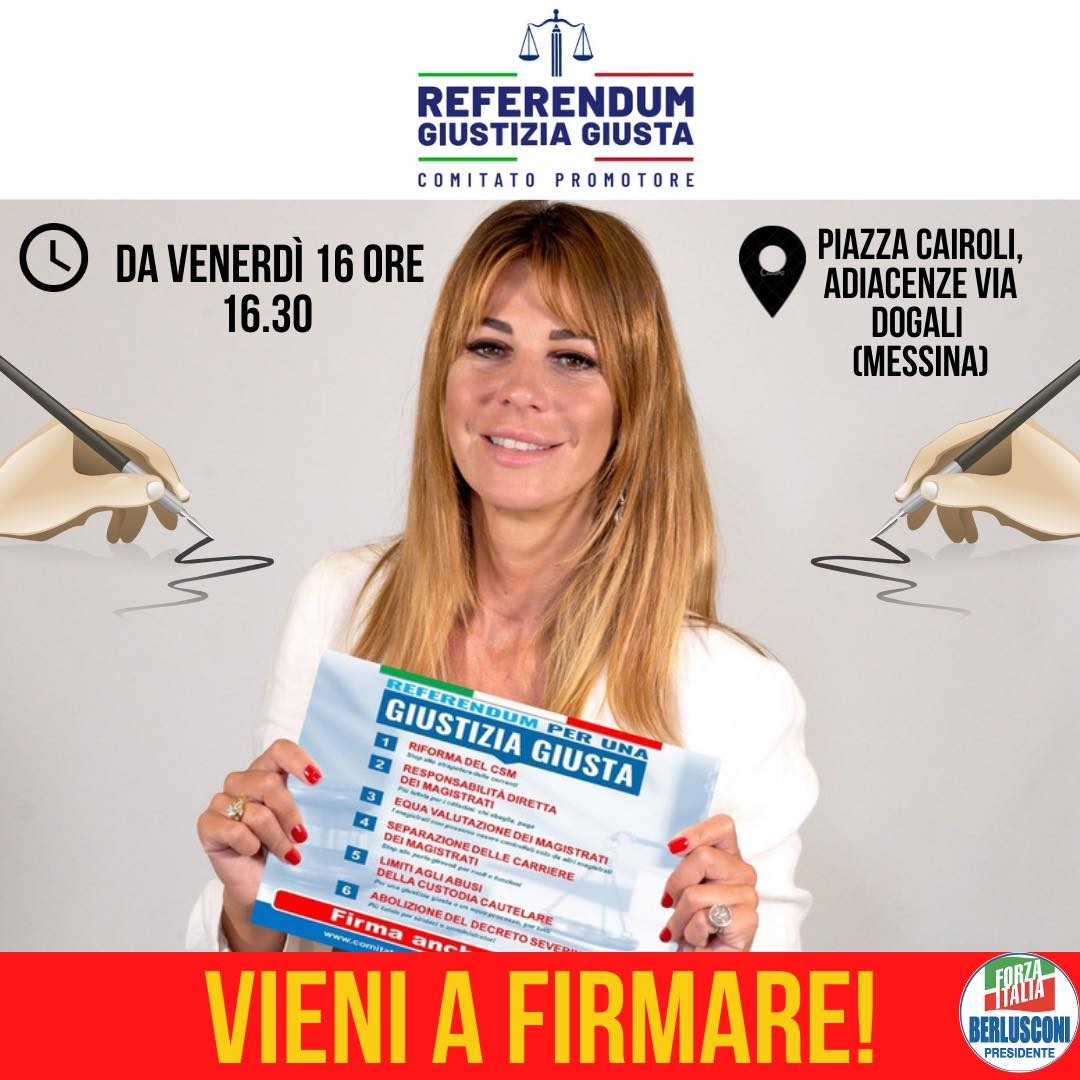 Vi aspettiamo numerosi: “oggi a Messina si firma per una Giustizia giusta”. Ha scritto così, stamane su Facebook, l’onorevole di Forza Italia a Montecitorio… la messinese Matilde Siracusano componente del relativo Comitato promotore dei Referendum chiesti sulla base quesiti posti dai proponenti della Lega e del Partito Radicale.