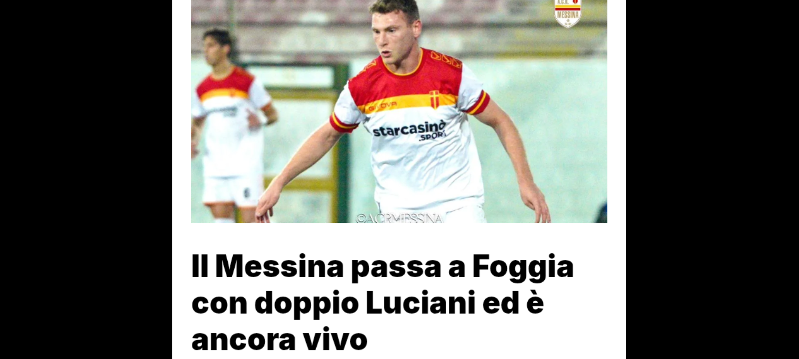 Gli ospiti contestano il pressing dopo la restituzione di un pallone e ne nasce un parapiglia: ammoniti Silvestro e Buchel, mentre Ingrosso viene allontanato dalla panchina. L’arbitro assegna un maxi-recupero di 6′, con il Messina che si riversa in avanti. Al 48′ Tordini impegna Perina che vola a deviare. Nell’ultimo minuto di recupero arriva l’1-2 di Luciani, a segno di testa su assist di Garofalo. Per la punta ex Frosinone, all’undicesima rete, è un momento magico. Si va al riposo col vantaggio, meritatissimo, dal Messina.