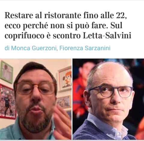 - In realtà la norma impone che non si può stare fuori dalla propria abitazione e dunque ci sarà tolleranza per casi particolari ma la circolare del Viminale esclude che si tratti di una regola. E anzi sollecita controlli proprio nei luoghi della movida e all’uscita dei locali. Sul coprifuoco si registra fortissima tensione all’interno della maggioranza. Il segretario del Pd Letta si è detto «stupito» per l’ultima iniziativa promossa da Salvini, quella di raccogliere online le firme contro la chiusura alle 22.
