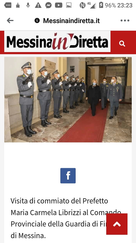 Visita di commiato del Prefetto Maria Carmela Librizzi al Comando Provinciale della Guardia di Finanza di Messina. Prima di lasciare Messina per andare a ricoprire l’omologo prestigioso incarico alla Prefettura di Catania, nella giornata di ieri 10 marzo, la dott.ssa Maria Carmela Librizzi ha voluto salutare personalmente le “Fiamme Gialle” recandosi presso la Caserma, intitolata alla medaglia d’oro al valor militare “Fin. Mare Stefano Cotugno”, ove è stata accolta dal Comandante Provinciale – Col. t. SFP Gerardo Mastrodomenico e da un picchetto d’onore in uniforme.