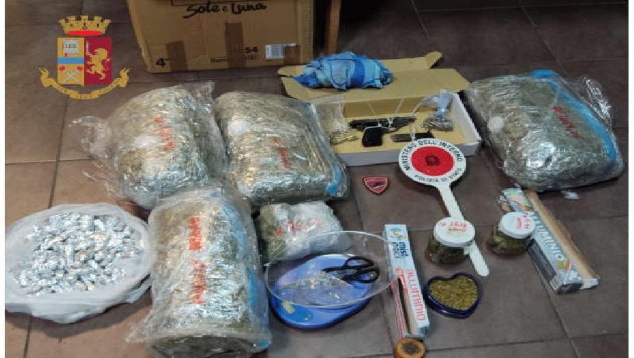Altra droga dello stesso tipo era distribuita in contenitori di vetro; un ulteriore quantitativo era conservato dentro un sacco di plastica. Anche nel ripostiglio e nella camera da letto vi erano evidenti tracce di cannabis. Infine, non mancava l’attrezzatura per il confezionamento delle singole dosi: una bilancia di precisione, un paio di forbici, carta stagnola. Il minuzioso sopralluogo di Squadra Mobile e Volanti ha permesso, successivamente, di rinvenire un involucro di plastica occultato sotto un mobile del salone. Dentro, protetta da teli di stoffa, una pistola semiautomatica con matricola abrasa.