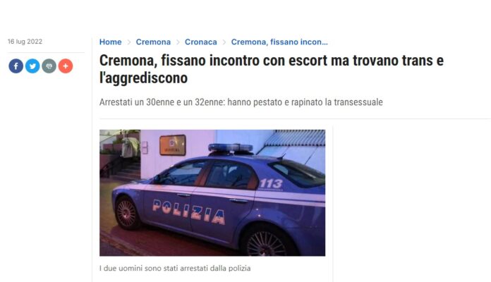 È successo in un appartamento della prima periferia di Cremona. I due uomini avevano letto l’annuncio su un sito di escort e, interessati dalla proposta di tale “Miranda”, hanno fissato l’appuntamento per un incontro a tre. Solo che una volta entrati in casa, pronti a qualche ore di trasgressione extraconiugale, si sono trovati di fronte una transessuale. A quel punto due uomini hanno pestato brutalmente la transessuale e, dopo avergli puntato un coltello alla gola, sono scappati con 500 euro, un computer e uno smartphone.