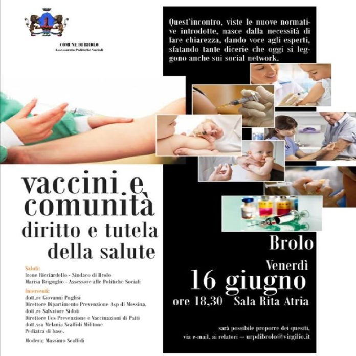 Oggi presso la Sala Rita Atria del Comune di Brolo (ME), alle ore 18.30, si terrà un convegno (organizzato dall’Assessorato alle Politiche Sociali) dal titolo: “Vaccini e comunità. Diritto e tutela della salute”.