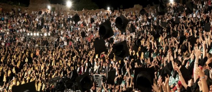 Per il quarto anno consecutivo il Teatro Antico di Taormina ha fatto da cornice alla Cerimonia di Consegna dei Diplomi di Laurea ai neo laureati dei corsi triennali, magistrali ed a ciclo unico di Unime. Più di 4mila le persone che hanno gremito il Teatro, assistendo ad una suggestiva serata dai contorni gioiosi e festosi. L’atteso evento, legato quest’anno al ricordo dei giudici Giovanni Falcone e Paolo Borsellino (a cui è stato dedicato un video) e di tutte le vittime della Mafia, è stato aperto dal Coro d’Ateneo, diretto dal Maestro Umberto Arena, che ha intonato il Gaudeamus igitur e l’Inno di Mameli.