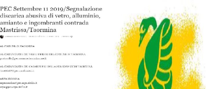 Nella giornata di ieri, a seguito di una segnalazione da parte del Circolo Legambiente di Taormina circa la presenza di una discarica abusiva di rifiuti di vario genere in località c.da Mastrissa è stata sequestrata una vasta area, nello stesso centro jonico.