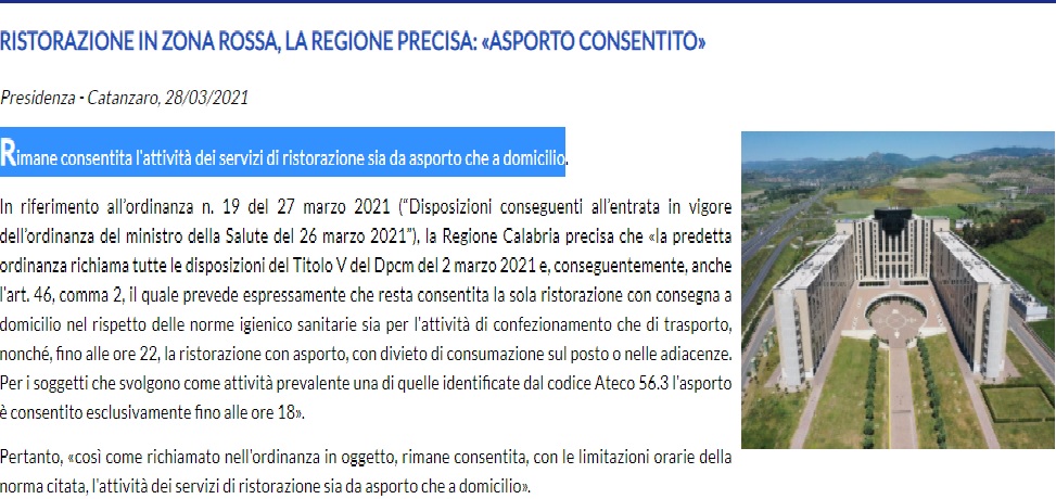 In riferimento all’ordinanza n. 19 del 27 marzo 2021 (“Disposizioni conseguenti all’entrata in vigore dell’ordinanza del ministro della Salute del 26 marzo 2021”), la Regione Calabria precisa che «la predetta ordinanza richiama tutte le disposizioni del Titolo V del Dpcm del 2 marzo 2021 e, conseguentemente, anche l’art. 46, comma 2, il quale prevede espressamente che resta consentita la sola ristorazione con consegna a domicilio nel rispetto delle norme igienico sanitarie sia per l’attività di confezionamento che di trasporto, nonché, fino alle ore 22, la ristorazione con asporto, con divieto di consumazione sul posto o nelle adiacenze. Per i soggetti che svolgono come attività prevalente una di quelle identificate dal codice Ateco 56.3 l’asporto è consentito esclusivamente fino alle ore 18».