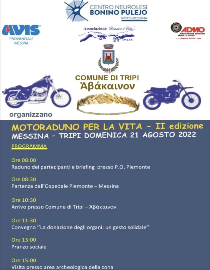 Si terrà il prossimo 21 agosto la II edizione del “Motoraduno per la Vita” organizzato dall’IRCCS Centro Neurolesi “Bonino Pulejo” di Messina in collaborazione con Avis sezione provinciale di Messina, Admo Messina e associazione onlus Donare è Vita presieduta da Gaetano Alessandro. La giornata di sensibilizzazione sulla donazione di sangue, organi e tessuti, quest’anno vede protagonista il Comune di Tripi, grazie alla sensibilità dimostrata dal sindaco Michele Lemmo.