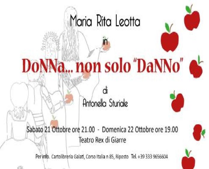 Per presentare lo spettacolo (che si terrà al teatro REX di Giarre, sabato 21 ottobre (ore 21) e domenica 22 ottobre ore 19), tratto dal suo libro -Donna non solo danno-, Antonella Sturiale, scrive: “è dunque prima di tutto un cammino verso questa -consapevolezza-, un -J’accuse- tutto al femminile, un percorso tra le varie strade dello scibile umano per dimostrare la grande -potenza- intellettiva, la grande forza fisica, l’impegno, l’abnegazione, la profonda spiritualità che contraddistingue -l’altra metà del cielo- (che, se vogliamo dirla tutta metà poi non è ma quasi i tre quarti)”.