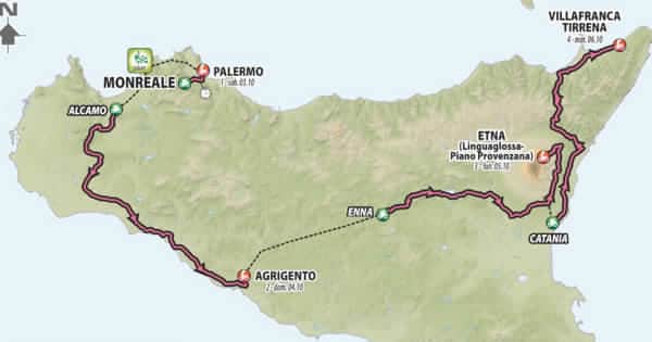 Si parte sabato 3 ottobre con la prima tappa, la cronometro individuale Monreale-Palermo di circa 16 km. Domenica 4 ottobre da Alcamo ad Agrigento, 150 km, con finale da finisseur. La terza frazione, Enna-Etna (Piano Provenzana 1.775) di 150 km, sarà il primo arrivo in quota del Giro d’Italia, lunedì 5 ottobre. Una salita inedita, già scalata in parte nel 2011, attaccata da nord (Linguaglossa) per giungere a Piano Provenzana. Martedì 6 ottobre ultima tappa sull’isola, con la quarta frazione da Catania a Villafranca Tirrena di 138 km, adatta ai velocisti.