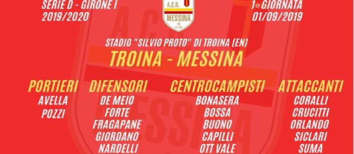 Con la rifinitura di questa mattina al “Despar Stadium” si è chiusa la preparazione del Messina finalizzata alla prima gara del torneo di Serie D edizione 2019/2020. La squadra di Cazzarò si prepara dunque al debutto in campionato, in programma domani pomeriggio al “Silvio Proto” di Troina. Il cammino dei giallorossi nel girone I inizierà dunque lontano da casa e senza pubblico, dopo le “porte chiuse” disposte dalla Prefettura di Enna a causa dei cantieri ancora attivi all’interno dello stadio del centro ennese.