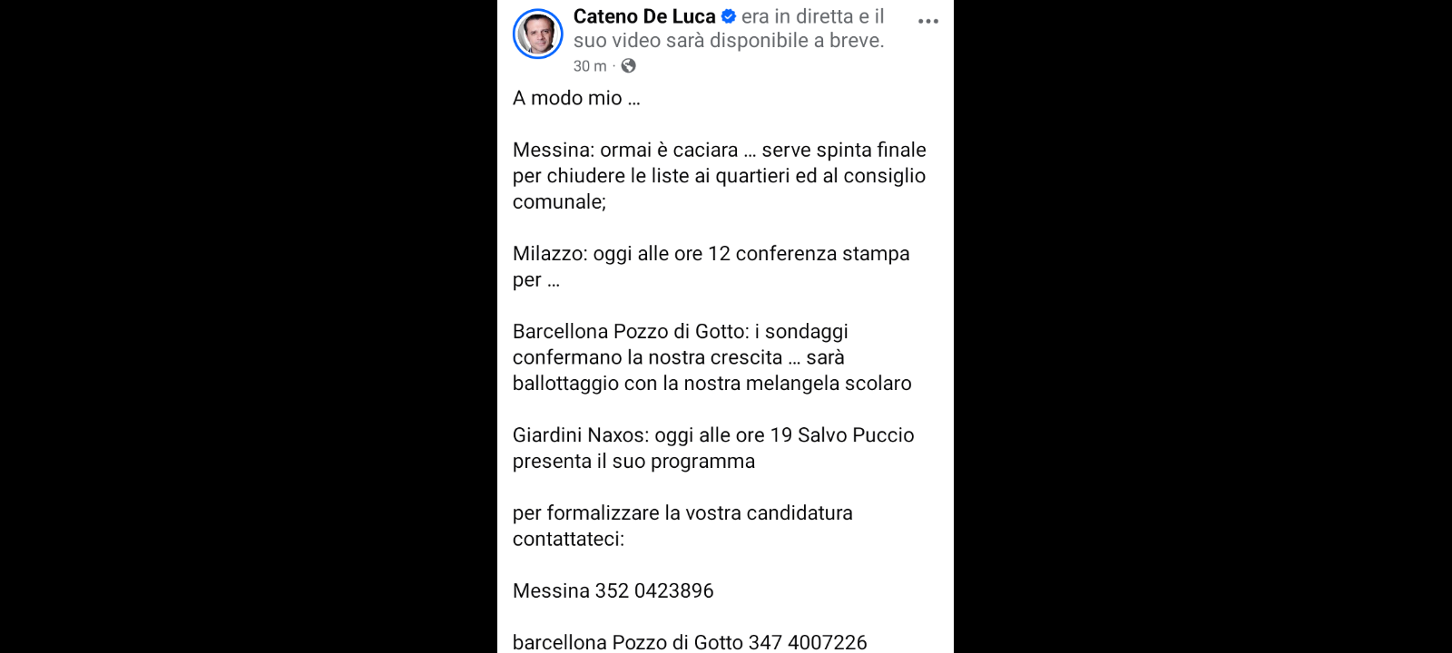 Con questo Articolo pubblicato su… www.messinamagazine.it, desideriamo tranquillizzare i cittadini messinesi e gli elettori che il 24 e 25 maggio 2026 si recheranno alle Urne per le Elezioni Amministrative che a Messina non c’è nessuna caciara come sostiene oggi su Facebook il fondatore di ‘Sud chiama Nord’ Cateno De Luca… e che il candidato alla carica di sindaco del centrodestra Marcello Scurria, non fa nessuna confusione