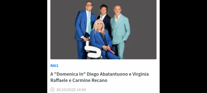 Domenica 26 ottobre alle 14.00 su Rai1, in diretta dagli Studi “Fabrizio Frizzi” di Roma, nuovo appuntamento con Domenica In, condotto da Mara Venier, in compagnia di Tommaso Cerno, Teo Mammucari ed Enzo Miccio. La sesta puntata ospiterà come sempre, i protagonisti della televisione, dell’attualità e dell’intrattenimento.