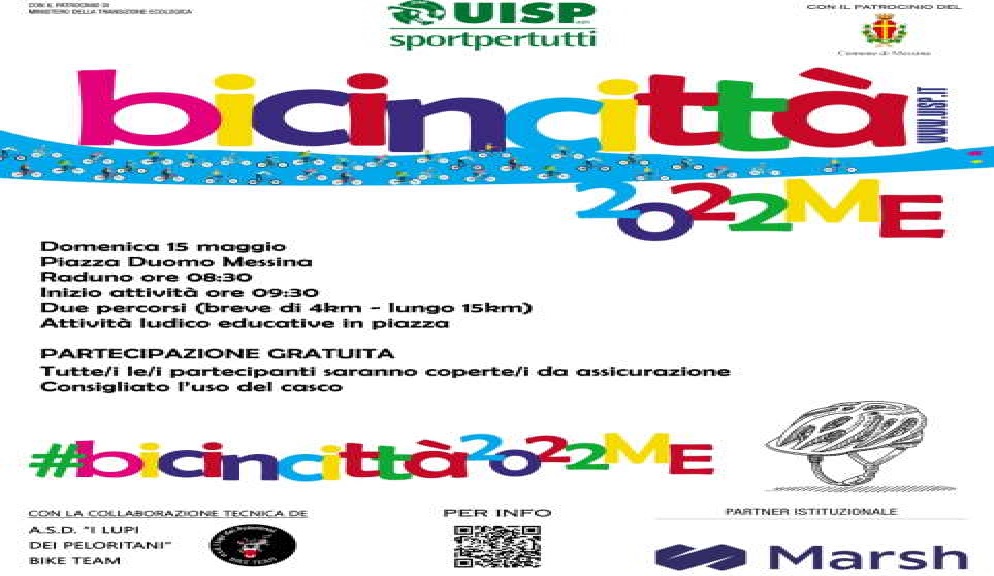 Dopo due anni di stop, dovuti all’emergenza sanitaria da Covid- 19, torna anche a Messina la manifestazione “Bicincittà”. L’evento ciclistico, organizzato da Uisp Messina con il patrocinio del Ministero della Transizione ecologica e del Comune di Messina, si svolgerà domenica 15 maggio e sarà presentato in conferenza stampa giovedì 12 maggio, alle ore 10, presso la sala Ovale di Palazzo Zanca, alla presenza di Santino Cannavò, presidente Uisp Comitato territoriale Messina Aps; Lino Ferrara, responsabile “Bicincittà Messina 2022; e di Paolo Interdonato dell’ASD “I Lupi dei Peloritani”.