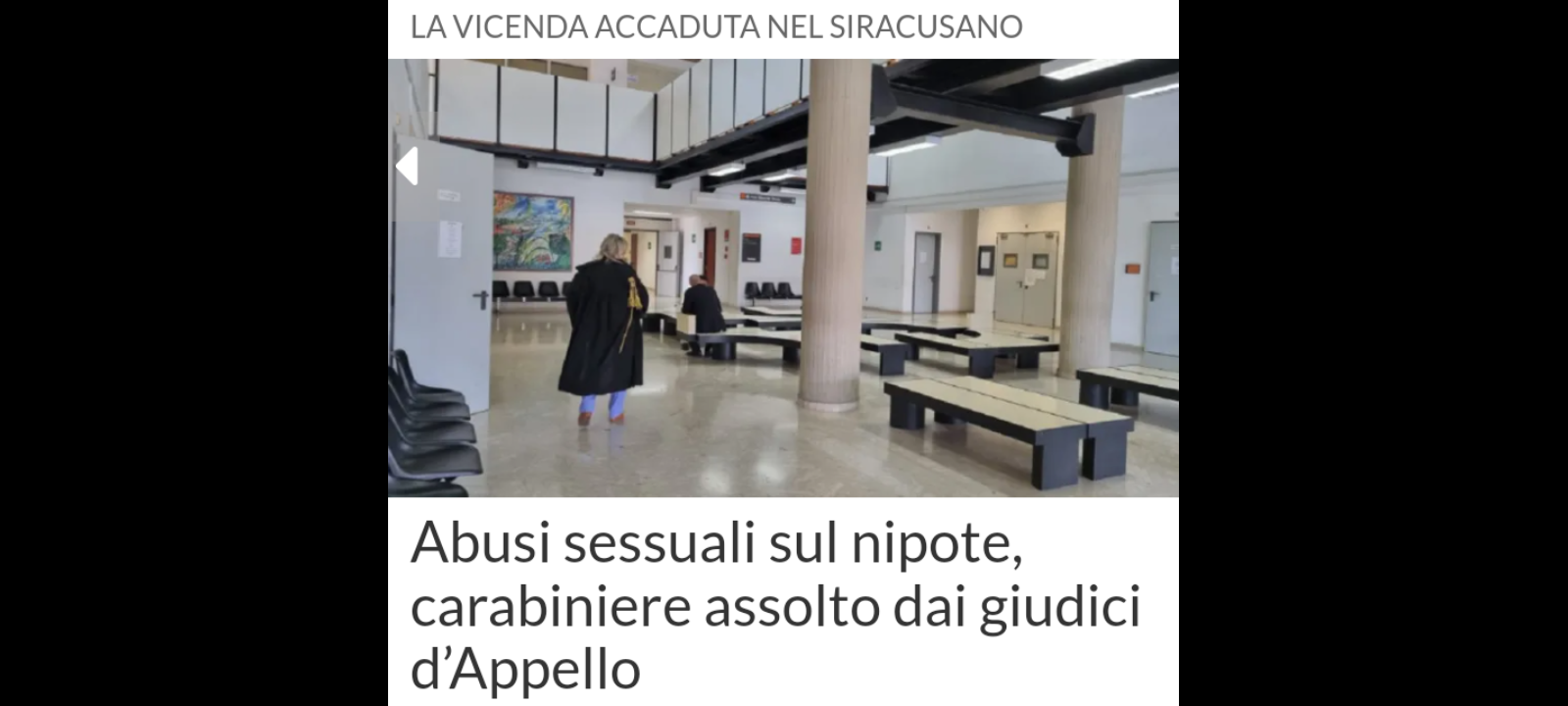 I giudici della seconda sezione penale della Corte di Appello di Catania hanno assolto perché il fatto non sussiste un appuntato dei carabinieri, in servizio al comando provinciale di Siracusa, 59 anni, finito sotto processo per abusi sessuali ai danni di un minore.