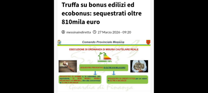 I militari del Comando Provinciale della Guardia di Finanza, su disposizione dei magistrati della Procura della Repubblica di Messina, nelle ore scorse hanno condotto una maxi operazione giudiziaria nel settore dei bonus edilizi… eseguendo un sequestro preventivo per un valore superiore a 810mila euro nei confronti di due persone e di una società cooperativa a loro riconducibile