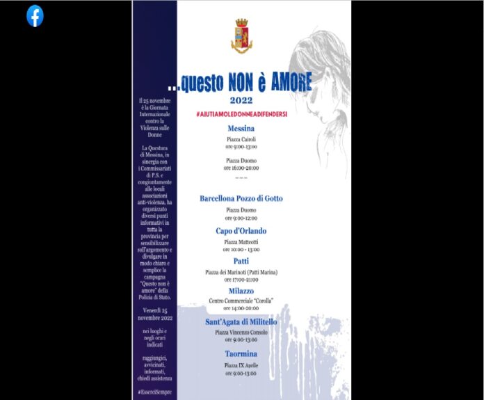 La Questura di Messina aderisce in prima linea alla campagna della Polizia di Stato contro la violenza di genere “Questo non è amore”, con un fitto calendario di attività di prossimità volte ad informare e sensibilizzare cittadine e cittadini sulla tematica e sugli strumenti di tutela e protezione delle vittime di violenza. In occasione della Giornata Internazionale per l’eliminazione della violenza contro le donne, il prossimo venerdì 25 novembre, a Messina ed in ciascun comune sede di Commissariato di Pubblica Sicurezza, saranno presenti punti informativi presieduti da personale della Polizia di Stato, congiuntamente ad associazioni e centri anti-violenza presenti sul territorio.