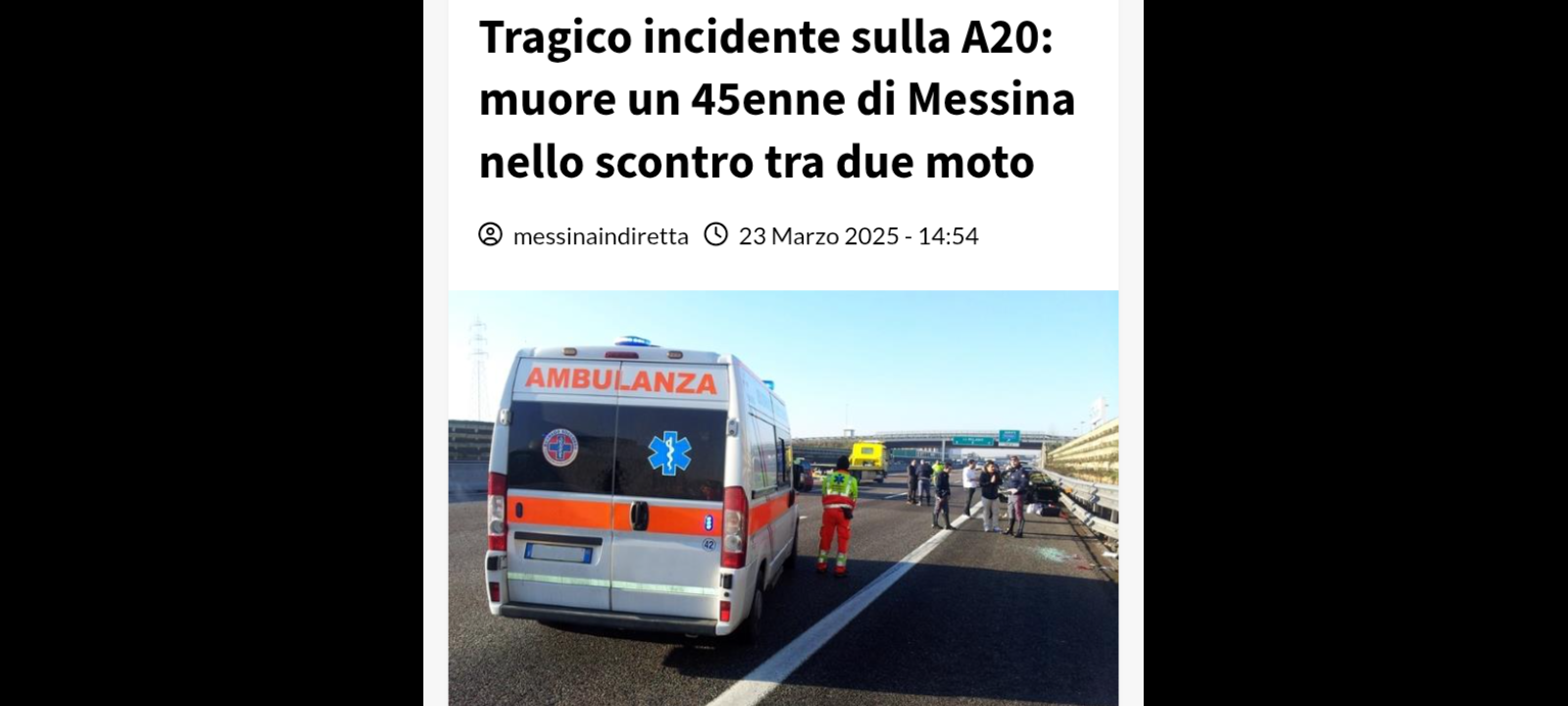 In uno scontro (le cui cause sono ancora in fase di accertamento da parte dei responsabili delle Autorità competenti intervenuti sul posto nella odierna mattinata) tra due moto…, avvenuto sulla A20 nelle immediate vicinanze dello Svincolo di Barcellona Pozzo di Gotto, nella carreggiata lato monte, ha perso la vita un motociclista messinese di 45 anni.