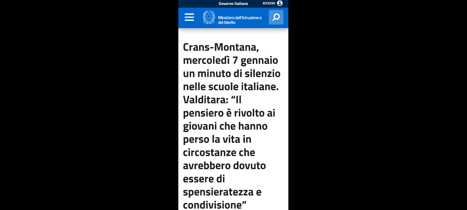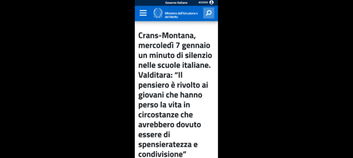Mercoledì 7 gennaio, in tutte le scuole italiane sarà osservato un minuto di silenzio in memoria delle vittime del tragico incendio avvenuto a Crans-Montana.