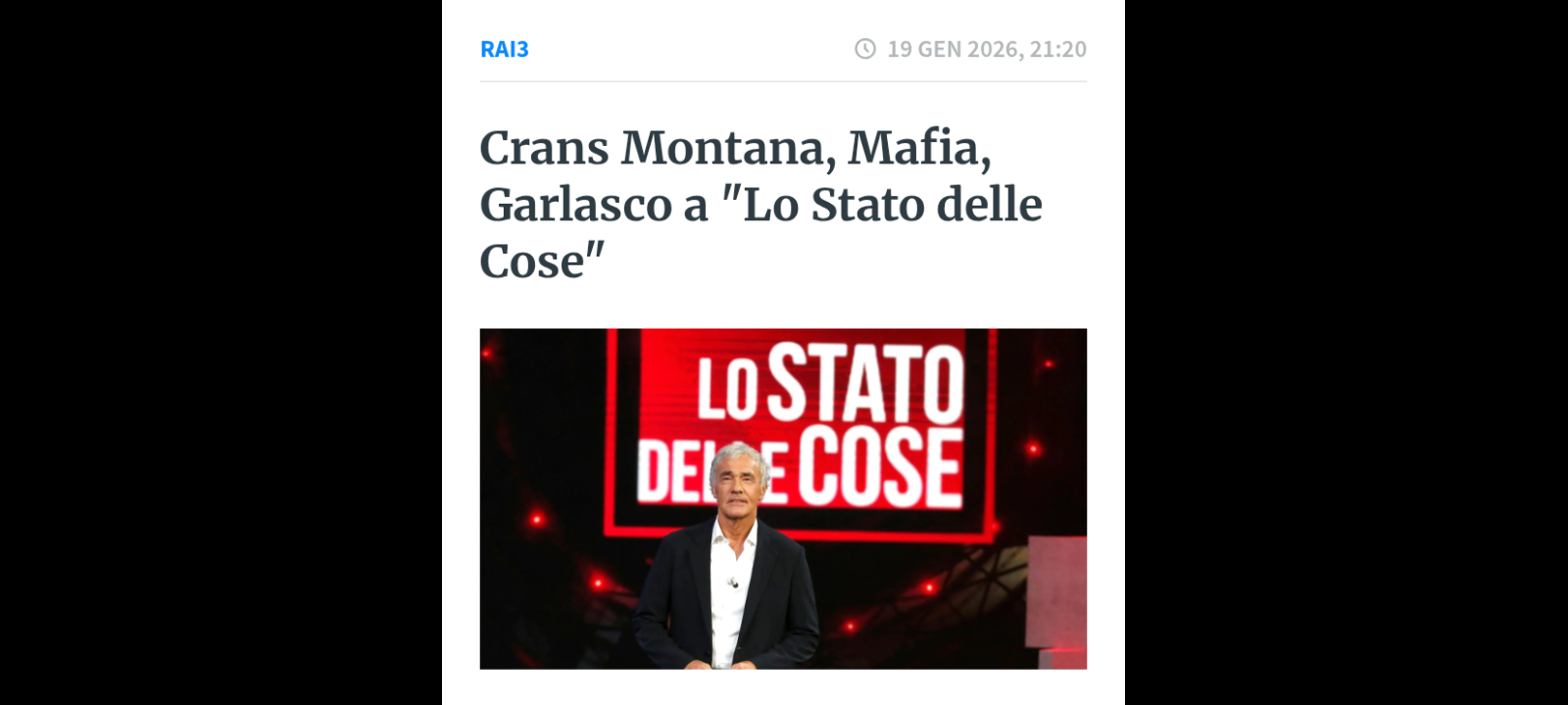 E si accendono i riflettori su Crans Montana dove la tragedia delle famiglie delle giovani vittime si intreccia con le bugie dei gestori del locale, i mancati controlli dell’amministrazione comunale e gli errori della procura svizzera. Riprende l’inchiesta sul consorzio mafioso denominato Hydra: ‘Ndrangheta Camorra e Mafia all’indomani della sentenza che ha condannato a 500 anni di carcere gli imputati.