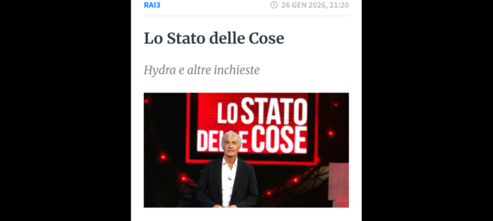 ‘Michele Santoro interviene sulla più stretta attualità, nazionale e internazionale; continua l’inchiesta sul consorzio mafioso della Lombardia chiamato Hydra come il mitologico mostro a tre teste, dove Camorra ‘Ndrangheta e Cosa nostra si spartiscono il territorio; poi, la tragedia di Crans Montana solleva polemiche per la scarcerazione, su generosa cauzione, del proprietario del locale, Jacques Moretti, dietro il quale si allunga e si fa più nera l’ombra della mafia corsa’. Sono questi, alcuni dei temi previsti lunedì 26 gennaio nell’appuntamento con “Lo Stato delle Cose” di Massimo Giletti, che è iniziato in onda alle 21.20 su Rai3.