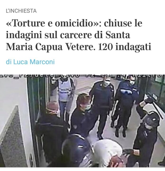 “Si sono concluse le indagini preliminari sulle violenze commesse da agenti della Penitenziaria ai danni dei detenuti del carcere di Santa Maria Capua Vetere. I fatti resi arcinoti dai video dei pestaggi circolati in rete, risalgono al 6 aprile 2020, stagione di proteste nei penitenziari italiani. Lo rende noto la stessa Procura sammaritana diretta da Maria Antonietta Troncone, che ha depositato l’avviso di conclusione delle indagini a carico di 120 persone, tra poliziotti della Penitenziaria e funzionari del Dap accusati a vario titolo dei reati di tortura, lesioni, abuso d’autorità, falso in atto pubblico, e cooperazione nell’omicidio colposo di un detenuto algerino”. A scrivere questo oggi sulla sua Pagina di Facebook, è stato il giornalista e prossimo conduttore de -I Fatti Vostri- su Rai2, Salvo Sottile.